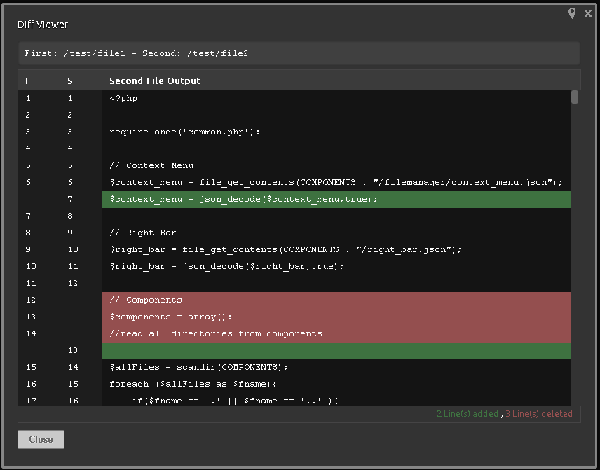 This plugin allows to compare 2 files and to see all changes made in it. The "Compare File" option is available in the contextmenu of the filemanager component.